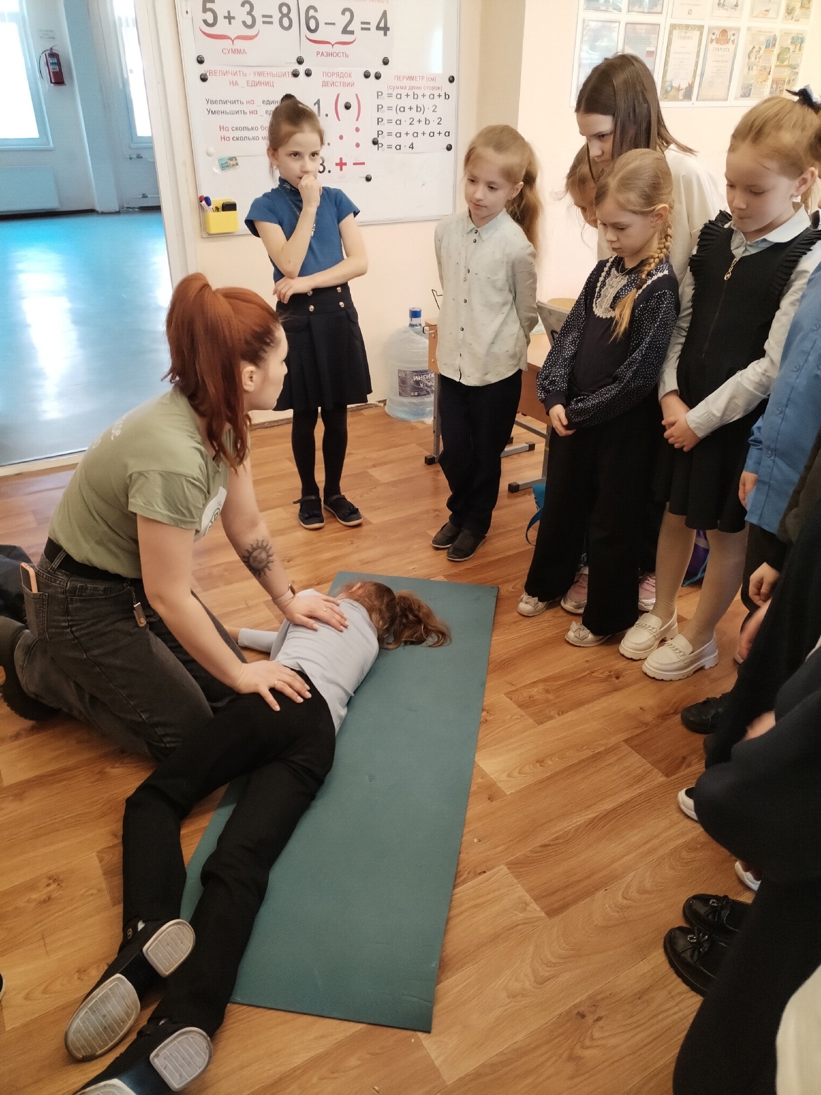 Ребята учились оказывать помощь в ситуации, когда остались дома одни и взрослому стало плохо: слушали дыхание и делали непрямой массаж сердца на манеке, узнали способ, как правильно и легко перевернуть пострадавшего.